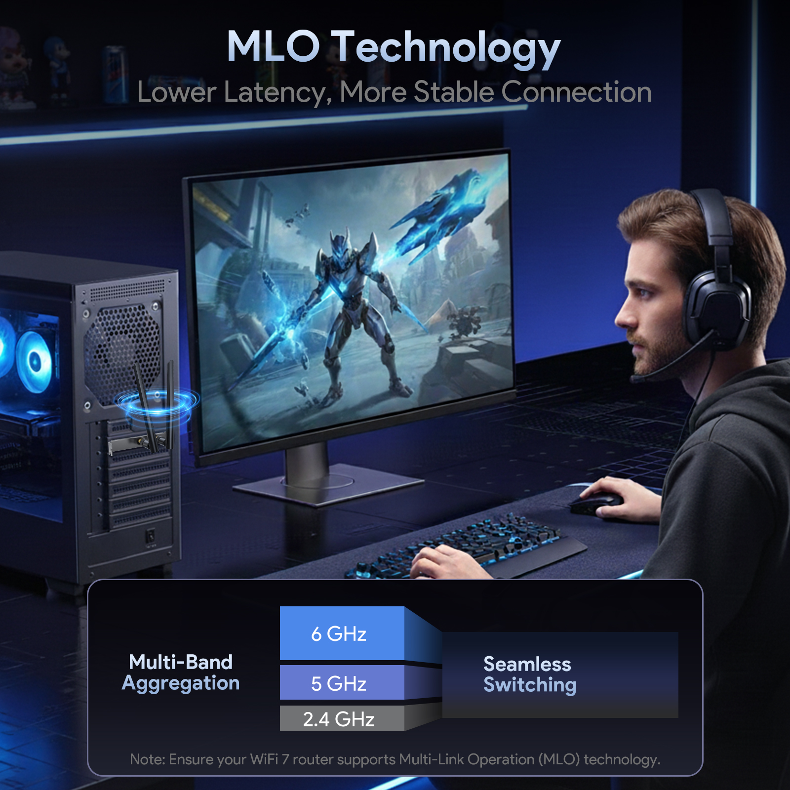 - When used with a Wi-Fi 7 router, EP-BE9726 supports Multi-Link Operation (MLO)* and up to ~6.5 Gbps theoretical throughput across 2.4 GHz, 5 GHz and 6 GHz bands.