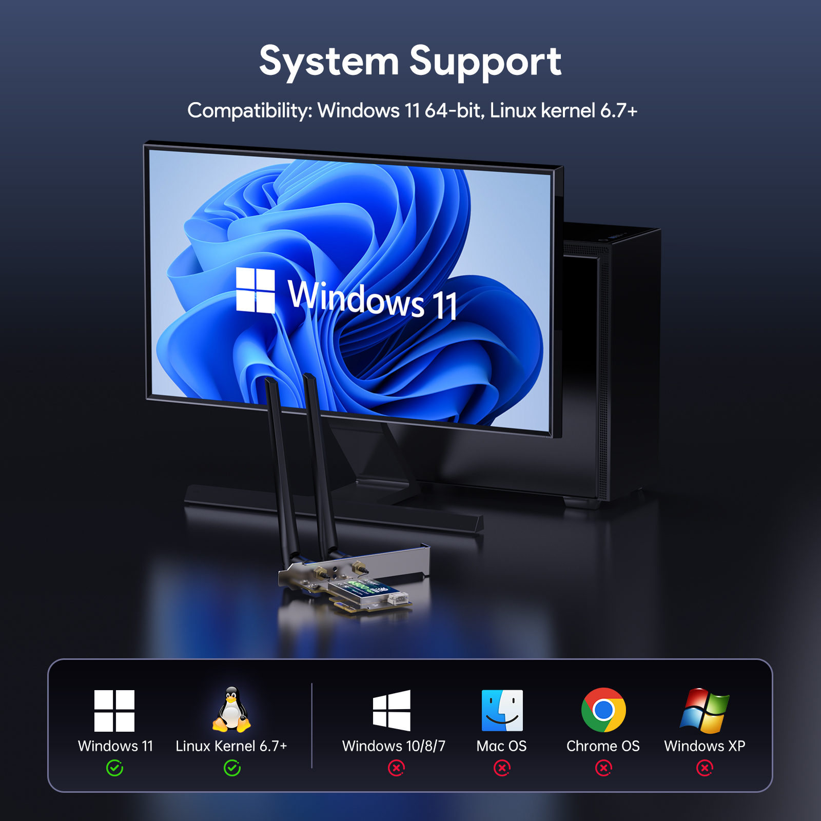 - Built with an optimized RF architecture and MAC-offload engine, the card minimises host CPU load and power consumption while maintaining robust wireless performance. The dual high-gain external antenna interface offers flexible installation and wide coverage, making it ideal for both consumer and industrial applications requiring high bandwidth and stable connectivity such as gaming, VR/AR, 4K streaming, automation control and industrial IoT.