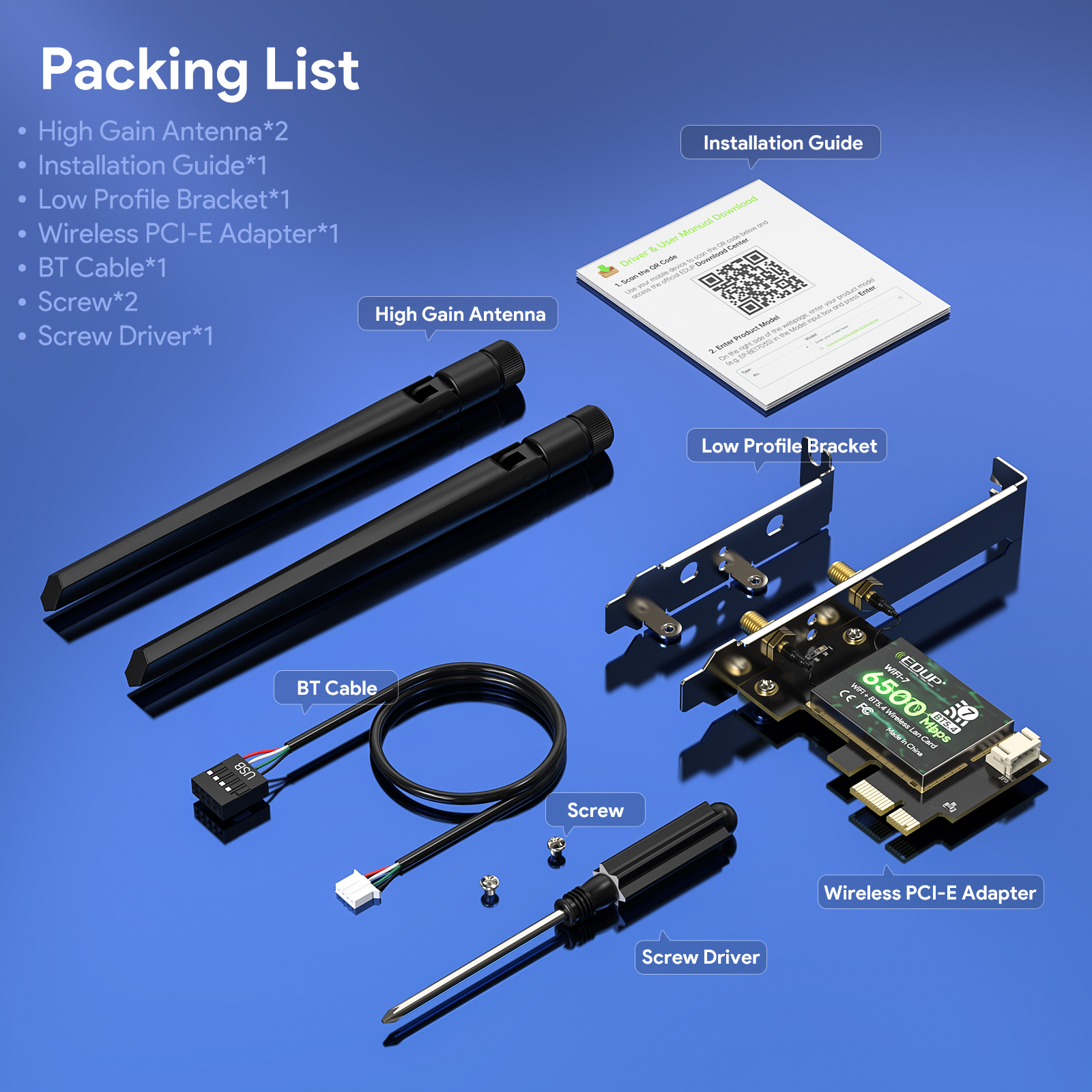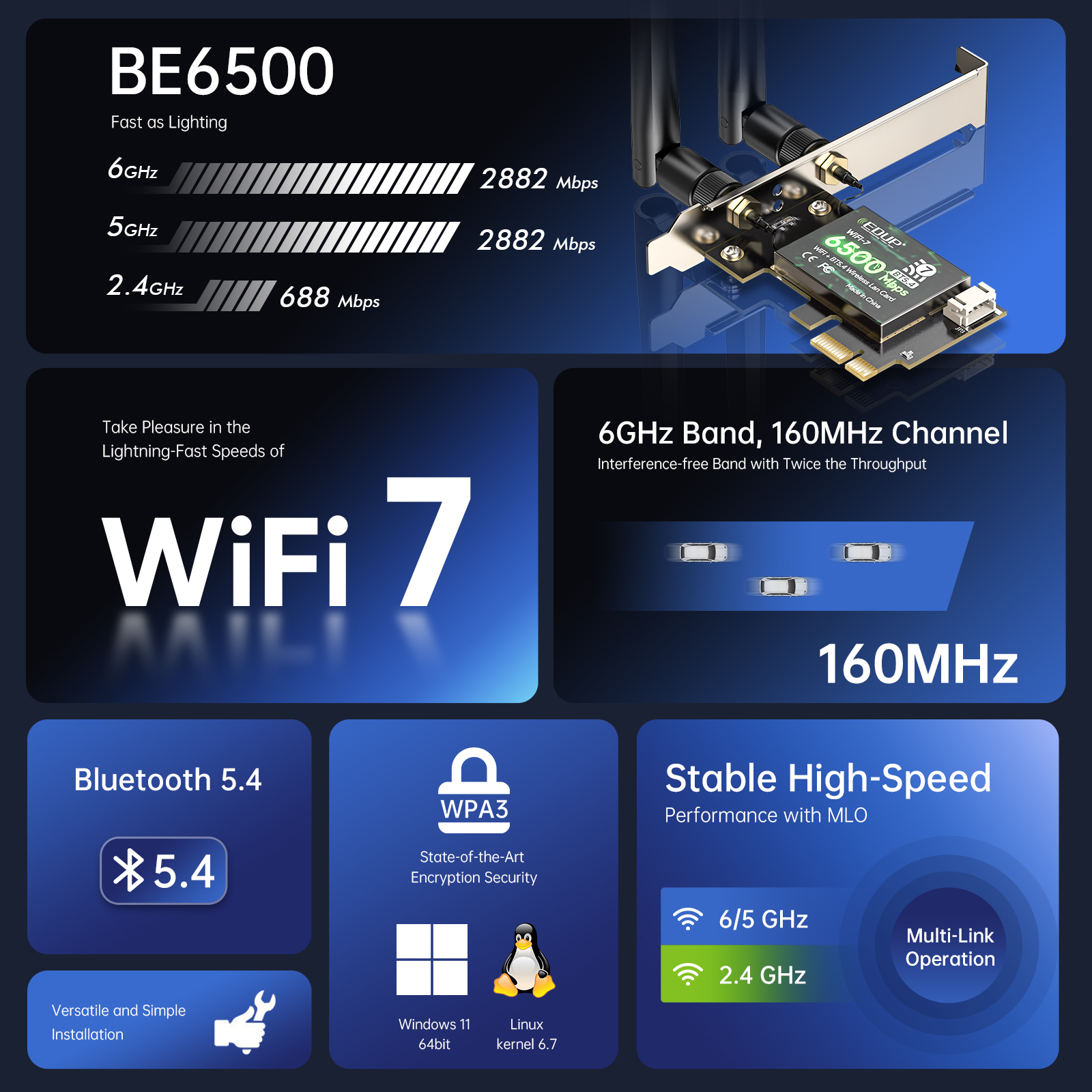 - The EP-BE9726 is a high-performance PCIe Full-Size wireless network card, designed for desktop PCs, industrial computers and embedded platforms. It supports Wi-Fi 7 (802.11be) and Bluetooth 5.4, delivering next-generation connectivity with ultra-low latency and excellent efficiency.